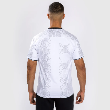 The bold design, with sublimated snakeskin graphics and black logo detailing, is a nod to the adrenaline-fueled experience of stepping into the Octagon.